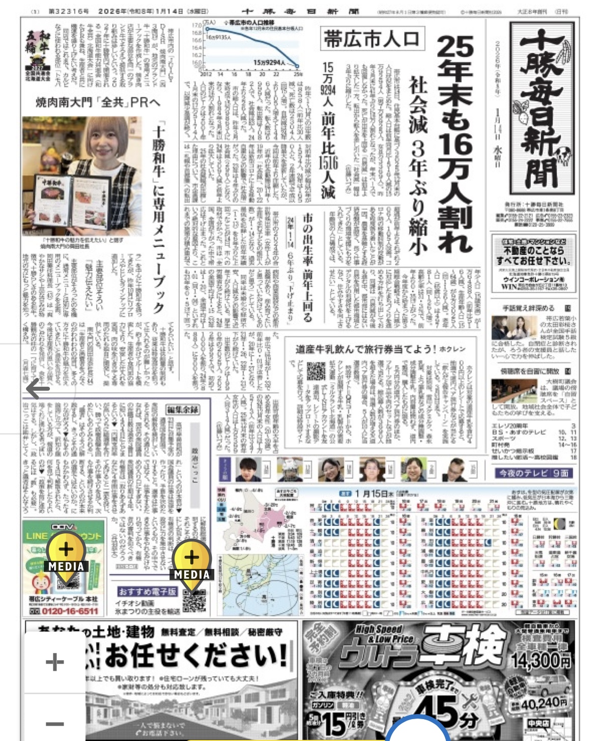 2026年1月14日付の十勝毎日新聞様の一面にて、